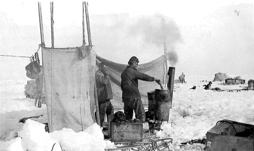 The cook sledge is under the charge of “Potash & Perlmutter.” “The “Colonel” really deserves a V.C. for the gallant way in which he has taken charge of & stuck to the culinary Dept. under the most adverse condition. He wears a furry cap, snow goggles, & a beard, which however is hardly distinguishable from the soot & blubber that covers the rest of his face….His Lieutenant de Cuisine, the Chef, is equally black, indefatigable and good natured.”