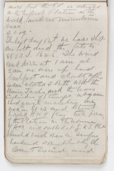 The last day out we have shot our bolt and the tale is 88.23 S 162 E. The wind eased down at 1 am. At 2 am we were up and had breakfast and shortly after 4 am started south with the Union Jacks and the brass Cylinder of Stamps. At 9 am hard quick marching we were in 88.23 and there hoisted H.M.’s flag took possession of the plateau in the name of H.M. and called it King Edward Plateau. Homeward Bound. Whatever regrets may be we have done our best.”