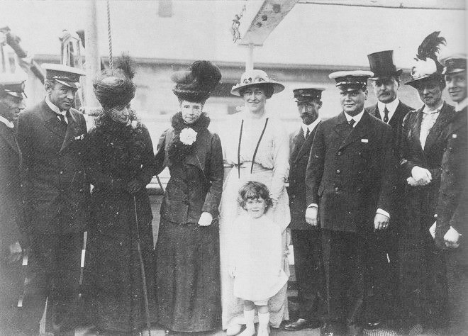 Ernest Shackleton (second from left), Queen Alexandra (third from left), Dowager Empress Maria Feodorovna of Russia, Emily Shackleton (in white), Edward Shackleton (child).