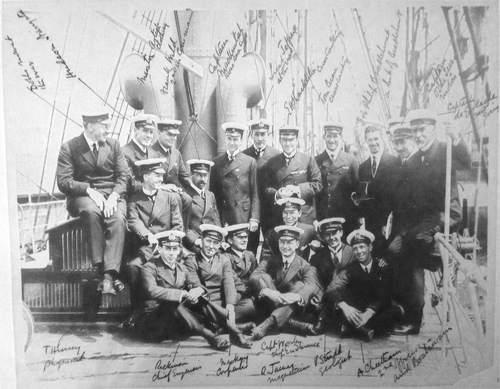 The crew of the Endurance, and Aeneas Mackintosh, captain of the Aurora, before setting sail from London, 1914