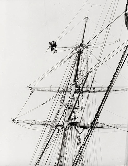 “Saw the New Year in at the wheel, under snowy conditions. A few enthusiasts joined in an Auld Lang Syne, but the majority were all sound in slumber. During the day had a very gratifying run, passing through vast fields of young ice, or rather recently formed ice in a rapid state of dissipation. The ship cut her way through in noble style, leaving a long wake which could be traced and remained open for a mile or so. I had a platform suspended from the job boom and secured some fine film. As well as pictures from the foretop yard…”